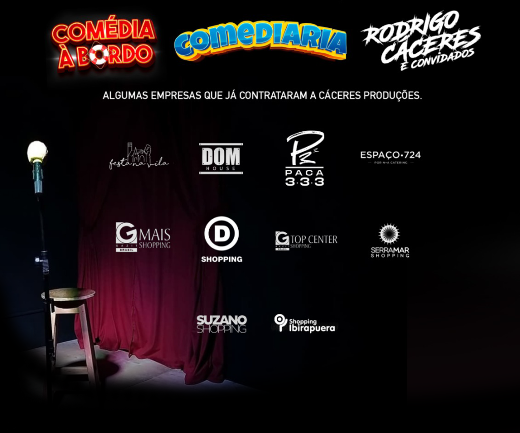 Com sua vasta experiência como humorista e produtor. Rodrigo conquistou uma grande credibilidade e amizade com os comediantes e profissionais da área artística. Por isso, fica muito mais fácil para coordenar um projeto de humor em teatros. casas de shows. bares, pubs, buffets, shopping, navio, entre outros. Levando para o seu estabelecimento um show totalmente personalizado, versátil e de fácil adaptação estrutural, podendo ser uma única apresentação, ou semanal, quinzenal, mensal, etc.. tudo organizado pela Cáceres Produções.